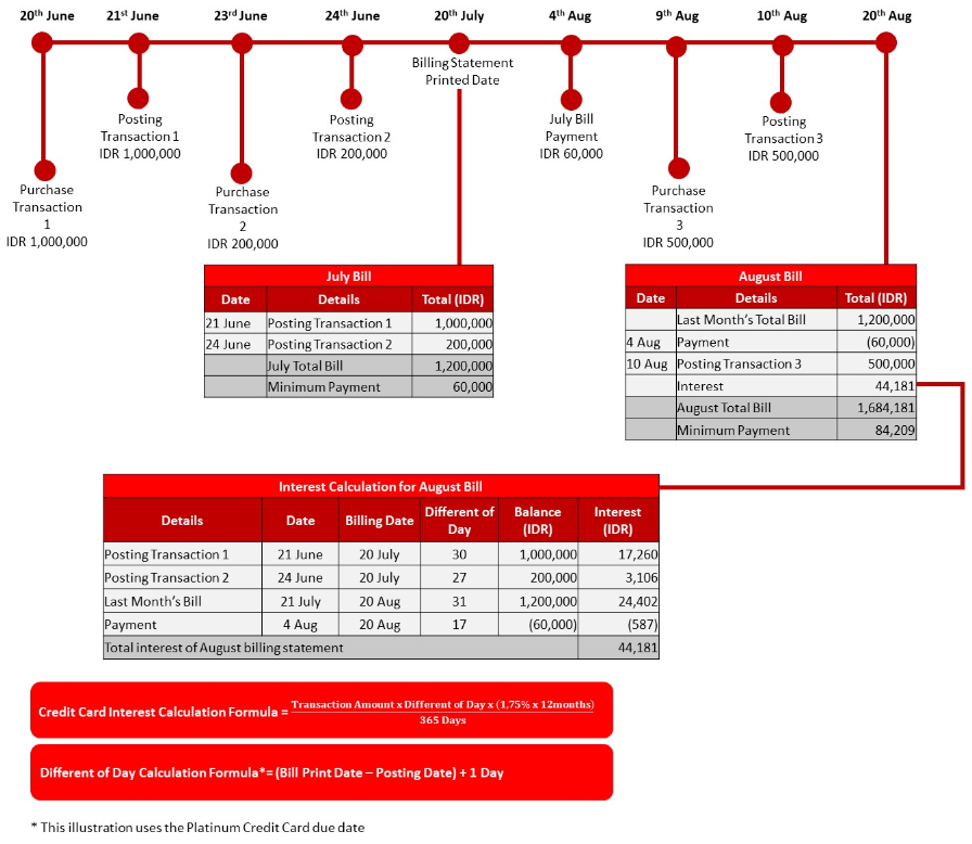 The minimum payment is 5% of the outstanding balance or IDR 50,000 (whichever higher)*. If your outstanding balance exceeds your credit limit, such excess shall be added to the minimum payment which is about to become due. If you have not paid off the previous month's minimum payment, such amount shall also be added to your minimum payment which is about to become due. If there is any instalment transaction, it shall be billed in full.